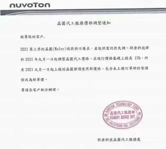 根据涨价函显示,由于今年第三季度的晶圆继续供不应求,产能失调,新唐科技将于9月1日开始上调晶圆代工价格,将在现行基础上提高15%。